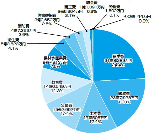 歳出は、総額で前年度に比べ5億724万円増額の130億1︐813万円となりました。教育費や農林水産業費などは減額した一方で、総務費や災害復旧費などが増額となりました。