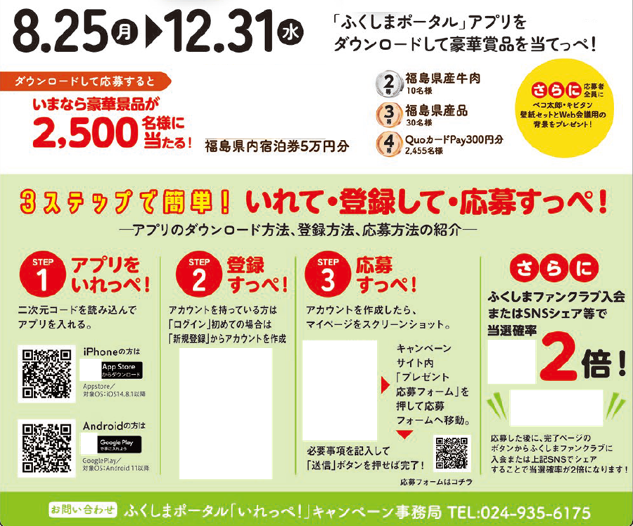 県では12月31日(水)まで、抽選で2,500名様に宿泊券などの豪華景品が当たる「ふくしまポータル」ダウンロードキャンペーンを実施しています。3ステップで簡単にご応募いただけますので、ぜひこの機会にダウンロードをお願いします。