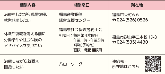 県内の一部のがん診療連携拠点病院では、ハローワークの職業相談員が出張個別相談(予約制)を行っています。