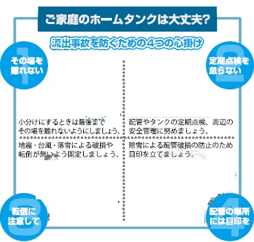 冬季になると、家庭のホームタンクから灯油が漏れ出し、河川などに流出する事故が多発します。