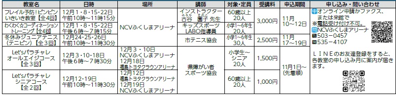 スポーツ 各種スポーツ教室 15/36 前の記事 次の記事 発行日 : 2025年11月01日 自治体名 : 福島県福島市 広報紙名 : ふくしま市政だより 令和7年11月号 ※申込者多数の場合は抽選。申込受付終了日の翌日に抽選を行います。当選の発表は払込票の発送をもってかえさせていただきます。(返金はできません。) Tweet シェアする [お知らせ]催し [お知らせ]施設だより(1)