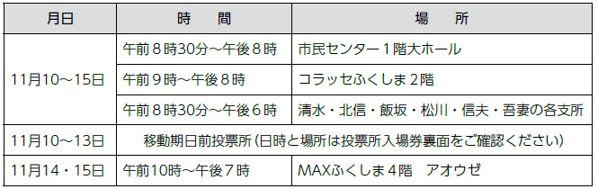 投票日に仕事や用事などで投票所に行けない場合に、ぜひご利用ください。下記のどの会場でも投票できます。