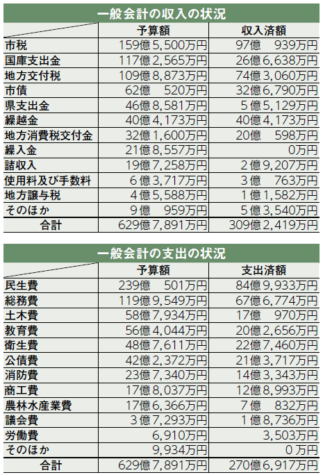 一般会計では、歳入歳出予算629億7,891万円のうち、約49.1%にあたる309億2,419万円の収入があり、約43.0%にあたる270億6,917万円を支出しました。
