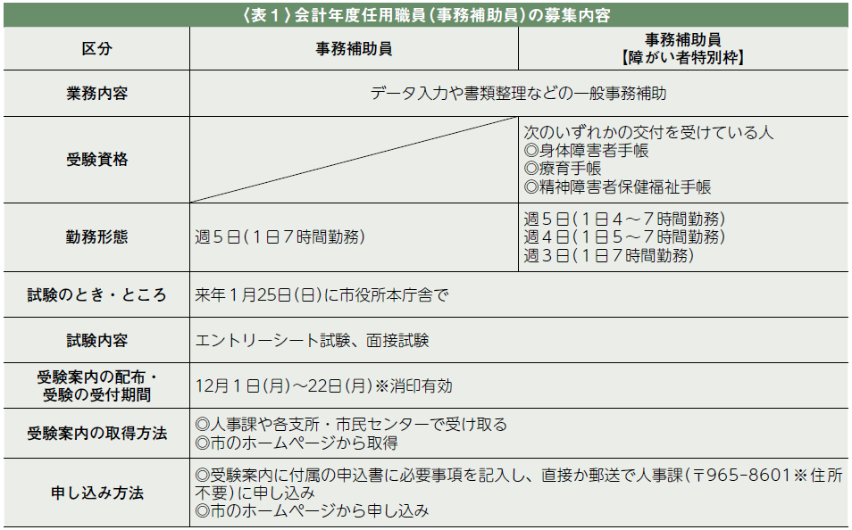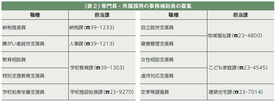 専門的な業務を行う専門員や、教育委員会事務局などで一般事務補助を行う事務補助員を募集します。勤務形態や試験内容などの詳細は、市のホームページからご確認ください。