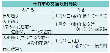 会津の冬の風物詩である十日市が1月10日(土)に開催されます。来場の際は、公共交通機関や近隣のコインパーキングをご利用ください。また、前日から交通規制が実施されますのでご注意ください。