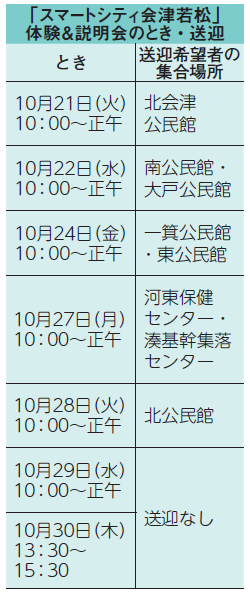 これまで市が取り組んできた「スマートシティ会津若松」の内容や、いま使えるデジタルサービスの説明(1時間程度)と本庁舎内のサービス体験会(30分程度)を行います。