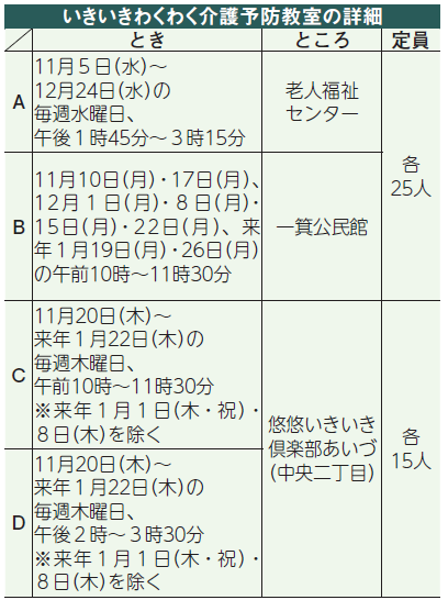 対象:概(おおむ)ね65歳以上で15分程度の運動ができ、要支援・要介護の認定を受けていないか事業対象者の判定を受けていない人
