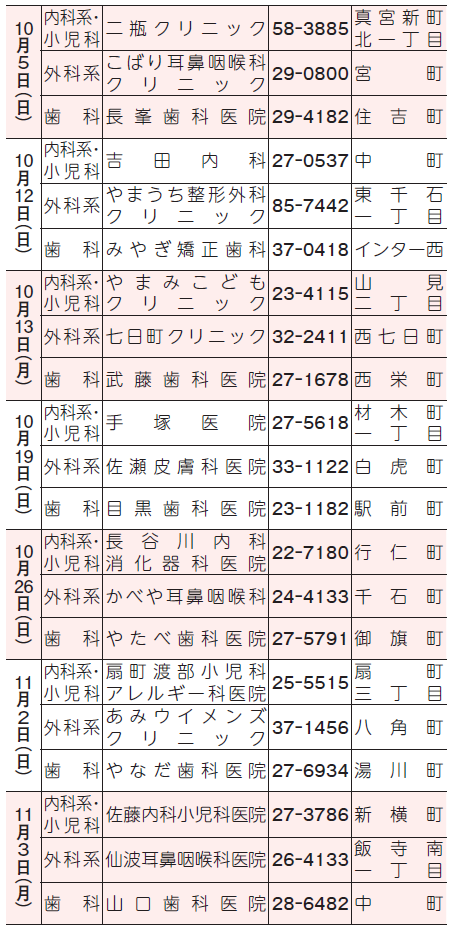 ※診療時間は午前9時から午後5時まで。ただし歯科医は午前10時から午後4時まで。「小児科」の記載がない医療機関を受診の際は、事前に問い合わせのうえ受診することをお勧めします