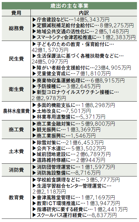 新庁舎建設や県立病院跡地の利活用などの公共施設の整備をはじめ、定額減税補足給付金などの物価高騰対策、デジタル技術を活用した「スマートシティ会津若松」の取り組みなど、市民生活や地域経済活動を支える取り組みを行いました。前年度と比較すると、市債の償還に係る公債費などが減少した一方で、新庁舎建設に係る総務費や、除排雪に係る土木費が増加したことにより、歳出総額は増加しました。