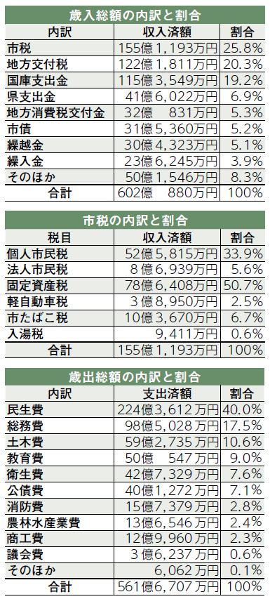 歳入は、企業動向の好転により法人市民税が増加したものの、定額減税の実施に伴い個人市民税が減少したことで、歳入の中心となる市税全体が減少しました。このほか、前年度からの繰越金や寄附金は減少したものの、基金繰入金や地方交付税、新庁舎建設に係る市債の増加などにより、歳入総額は増加しました。
