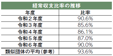 「経常収支比率」とは、人件費や公債費などの毎年決まって支出する経費に、市税や普通交付税などの毎年決まって入ってくる収入がどの程度使われているかを示す比率です。この比率は自治体の財政の弾力性を表し、この数値が低いと、新たな行政需要に対して自治体が柔軟に対応できることを示しています。令和6年度の本市の比率は、歳出における扶助費の増加などにより上昇しています。