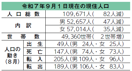 その他 人口と世帯数 42/45 前の記事 次の記事 発行日 : 2025年11月01日 自治体名 : 福島県会津若松市 広報紙名 : あいづわかまつ市政だより 令和7年11月号 ※福島県の推計人口より掲載。増減数は前月比 令和7年9月1日現在の外国人住民数(住基人口):1,161人(男523人・女638人) 問合せ:企画調整課 【電話】39-1215 Tweet シェアする 市の広報番組 今月の病院情報11月