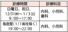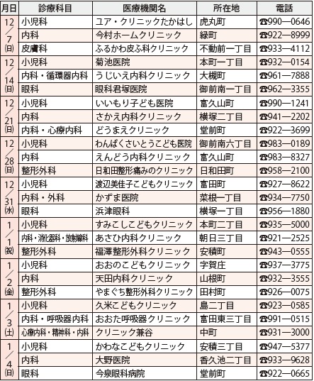 年末年始は医療機関の休診が多く、大変な混雑が予想されます。計画的に、かかりつけ医・歯科医・薬剤師へ早めの受診や相談をお願いします。なお、休日当番医は今後変更になる可能性がありますので、事前に電話確認のうえ受診ください。