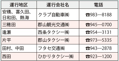 運行エリア:舞木町、阿久津町、白岩町、下白岩町、安原町、蒲倉町、荒井町、横川町、あぶくま台、大平町(簓田(ささらだ)地区を除く)