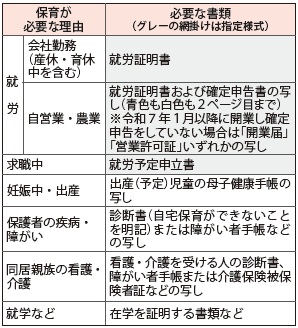 ※(1)~(3)および(4)のうち就労証明書と就労予定申立書の用紙は、各認可保育施設、保育課で配布中。市ウェブサイトからもダウンロードできます。