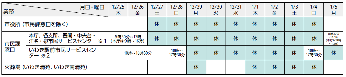 ※1 戸籍届(出生・死亡・婚姻・離婚届など)の受付は、休日・時間外にかかわらず、本庁は24時間(火葬関係許可証の発行は8時30分~17時)、小名浜・勿来・常磐支所は8時30分~17時です