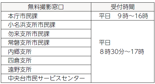 12月1日(月)から無料撮影の窓口として、四倉支所および遠野支所を追加しましたので、ぜひご利用ください。