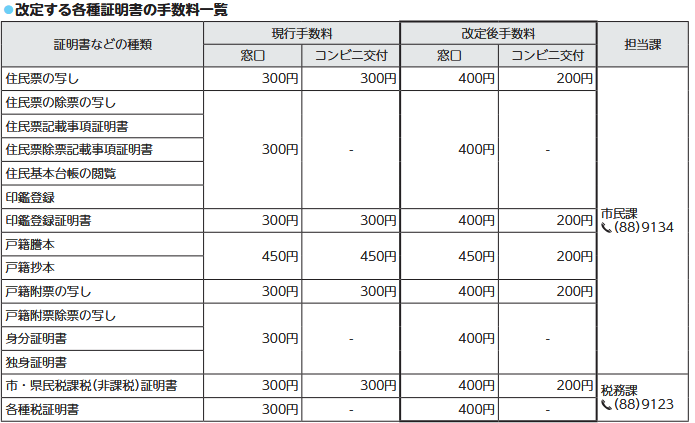 市民課や税務課、出先機関で取得できる各種証明書の手数料を、次のとおり改定します。証明書コンビニ交付サービスで取得できる証明書の手数料は引き下げますので、ぜひご利用ください。
