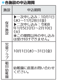 申込期間:各施設の申込期間は、下の表をご覧ください。