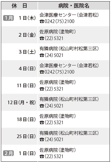 くらし 休日の輪番制病院(2次救急) 29/36 前の記事 次の記事 発行日 : 2026年01月01日 自治体名 : 福島県喜多方市 広報紙名 : 広報きたかた 令和8年1月号 No.241 ※事前に電話をしてから受診してください。 Tweet シェアする 休日の当番医(初期救急)・薬局 喜多方プラザ催し物のご案内