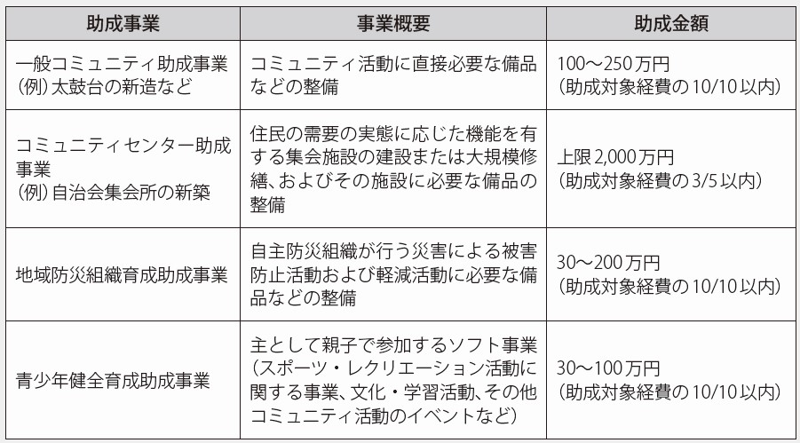 内容:地域のコミュニティ活動の充実・強化を目的とした事業への助成を行っています。応募多数の場合は、事業の必要性・緊急性などから選定しますのでご了承ください。
