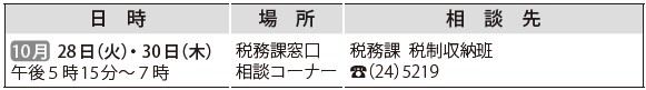 くらし 納税相談 22/33 前の記事 次の記事 発行日 : 2025年10月01日 自治体名 : 福島県喜多方市 広報紙名 : 広報きたかた 令和7年10月号 No.238 開庁時間内(午前8時30分~午後5時15分)の納税相談や来庁納付が難しい方は利用してください。 Tweet シェアする 各種相談日 健康相談