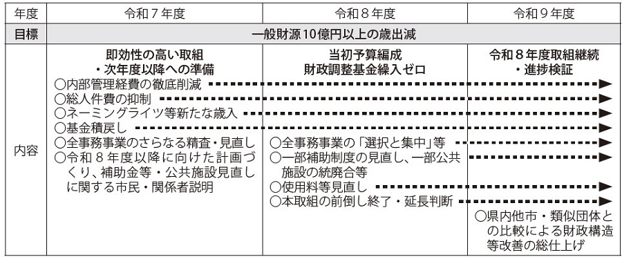 数値目標:財政調整基金残高を15億円以上の確保および基金残高確保のため、令和7年度以降一般財源10億円以上の歳出減