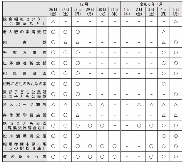 次の施設は12月31日(水)、1月1日(木)の間、休業。