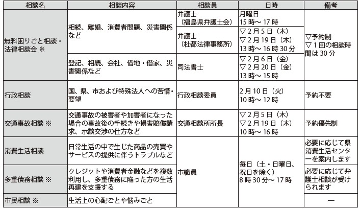 日常生活の中で悩んでいることや、疑問に感じていることなどを解決へ導くため、次の相談窓口を開設しています(※印のある相談は、市内在住・市内勤務の方などが対象です)。