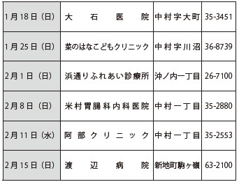 くらし 休日当番医 37/39 前の記事 次の記事 発行日 : 2026年01月15日 自治体名 : 福島県相馬市 広報紙名 : 広報そうま (令和8年1月15日号) ※変更となる場合があります。 ・診療時間は9:00~16:00 ・救急医療病院は公立相馬総合病院(【電話】36-5101)、相馬中央病院(【電話】36-6611) Tweet シェアする 相馬市内の交通事故発生状況 休日歯科当番医