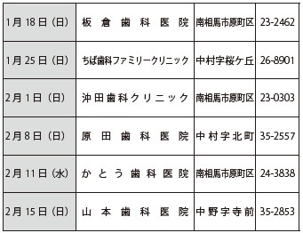 くらし 休日歯科当番医 38/39 前の記事 次の記事 発行日 : 2026年01月15日 自治体名 : 福島県相馬市 広報紙名 : 広報そうま (令和8年1月15日号) ※変更となる場合があります。 ・診療時間は9:00~16:00 Tweet シェアする 休日当番医 広報そうま (令和8年1月15日号)