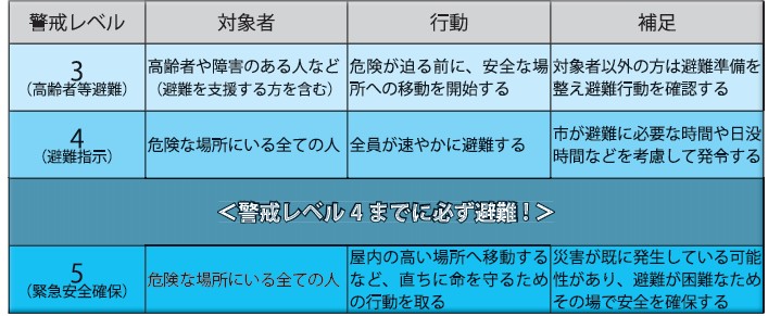 下表の警戒レベルの内容を正しく理解し、自分の状況に適した行動を取ってください。
