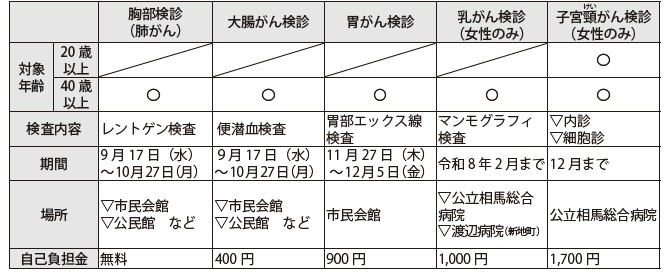 現在、申し込みができるがん検診は次のとおりです。申し込みや変更は早めに連絡ください。