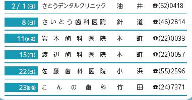 休日緊急歯科当番医は、緊急な場合の応急処置的な治療を目的に開設しています。緊急を要しない場合や高度な治療を必要とする場合は、通常の開業時間に受診ください。なお、当番医が変更になる場合がありますのでご注意ください。