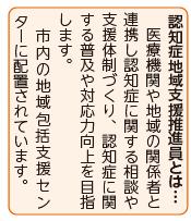認知症は早期発見・早期対応が重要です。自分が、家族が認知症かもしれない…そんな不安が生じたときは「地域包括支援センター」にご相談ください。