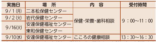 ※相談担当 保健相談…保健師、栄養相談…栄養士、歯科相談…歯科衛生士、こころの健康相談…臨床心理士