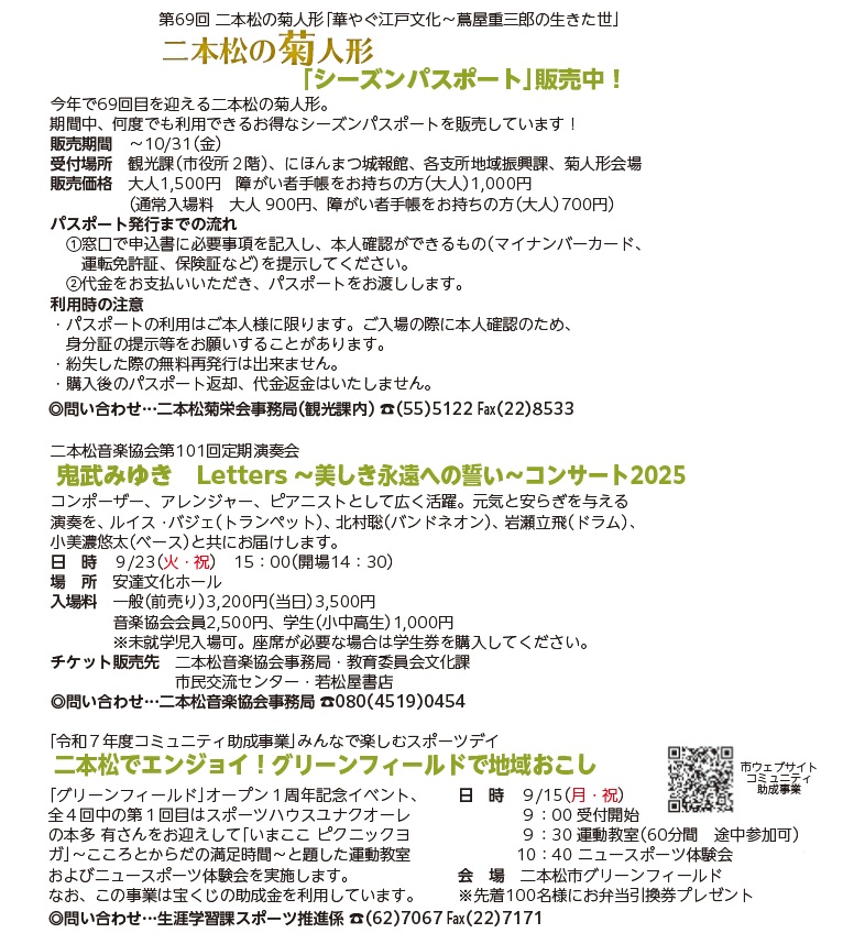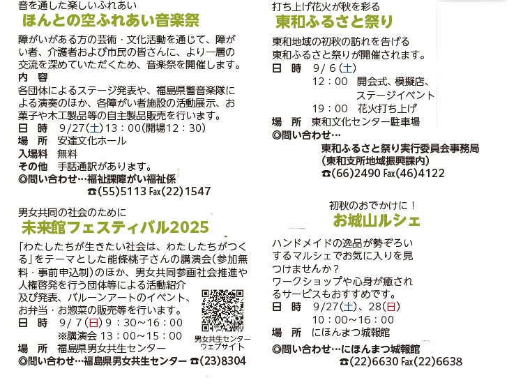 イベント にほんまつイベント and ニュース 29/39 前の記事 次の記事 発行日 : 2025年09月01日 自治体名 : 福島県二本松市 広報紙名 : 広報にほんまつ 令和7年9月号 Tweet シェアする 図書館だより Nihonmatsu City Public Library 〝アンコン〟について学ぼう