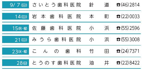 休日緊急歯科当番医は、緊急な場合の応急処置的な治療を目的に開設しています。緊急を要しない場合や高度な治療を必要とする場合は、通常の開業時間に受診ください。なお、当番医が変更になる場合がありますのでご注意ください。
