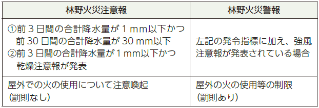 岩手県の大規模林野火災を受けて、8年1月1日(木)から林野火災の予防上注意を要する気象状況になった場合、「林野火災注意報・警報」が発令されます。この注意報や警報が発令された場合、屋外での火の使用が制限されますのでご注意ください。