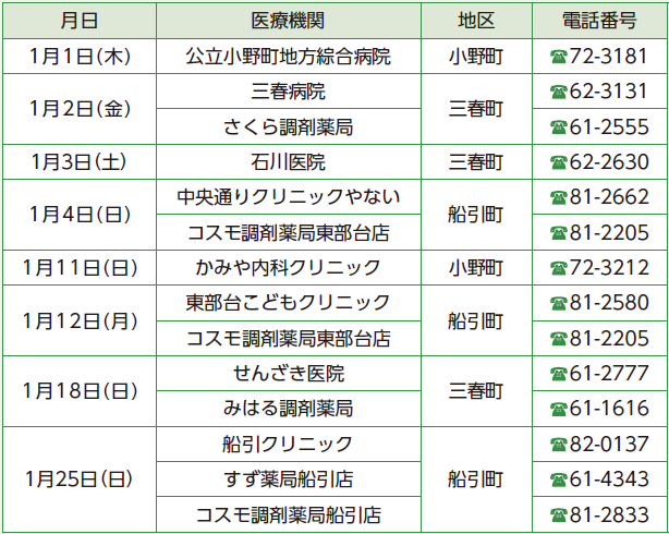 くらし ほけんだよりー1月の休日当番医ー 34/38 前の記事 次の記事 発行日 : 2025年12月01日 自治体名 : 福島県田村市 広報紙名 : たむら市政だより 令和7年12月号 診療時間:9:00〜18:00 ※医療機関によっては17:00まで 変更される場合があります。受診前に、医療機関に確認してください。 福島医療情報ネットのホームページからも検索することができます。 Tweet シェアする ほけんだよりーたむら市民病院からー My Angel