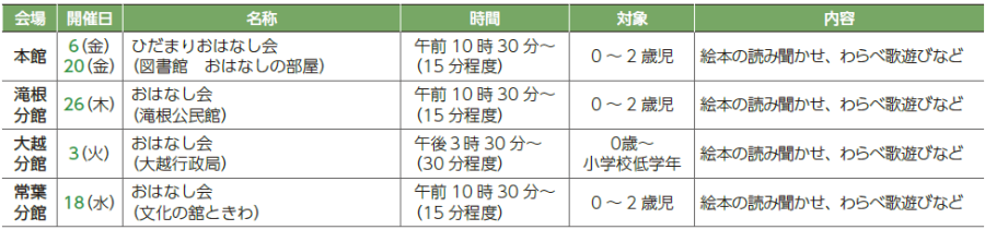 ・滝根分館特別整理期間休館のお知らせ…蔵書点検に伴い、2月10日(火)~13日(金)まで休館します。期間中は市内各館をご利用ください。