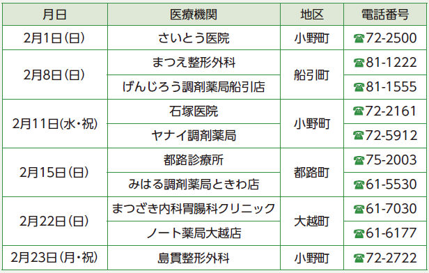 くらし ほけんだよりー2月の休日当番医ー 43/47 前の記事 次の記事 発行日 : 2026年01月01日 自治体名 : 福島県田村市 広報紙名 : たむら市政だより 令和8年1月号 診療時間9:00〜18:00 ※医療機関によっては17:00まで 変更される場合があります。受診前に、医療機関に確認してください。 福島医療情報ネットのホームページからも検索することができます。 Tweet シェアする ほけんだよりーたむら市民病院からー My Angel