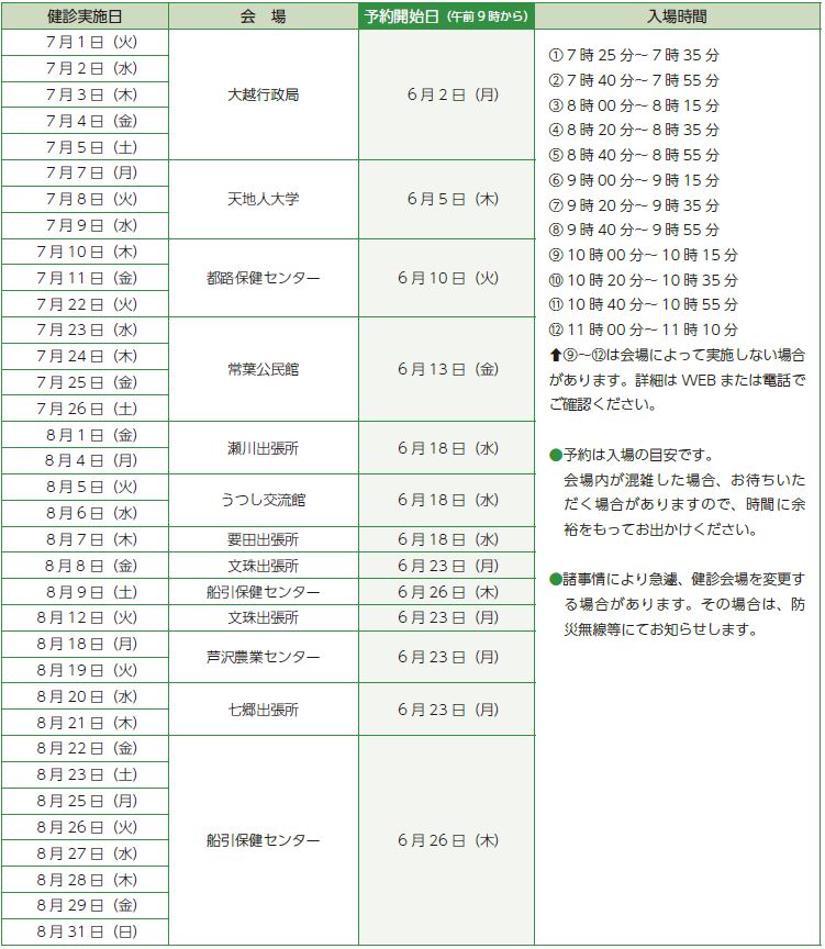 7年度総合健診を次の日程で実施します。年に一度、自分の健康をチェックする大切な機会です。必ず受診しましょう。完全予約制での実施です。必ず受診予約をしてください。総合健診や予約に関する詳細は、市から郵送する書類をご確認ください。