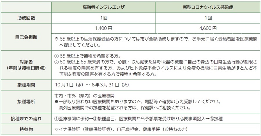 市は、感染症予防と重症化予防を目的として、高齢者の予防接種費用の一部を助成します。希望される方は医療機関へ直接予約をお願いします。