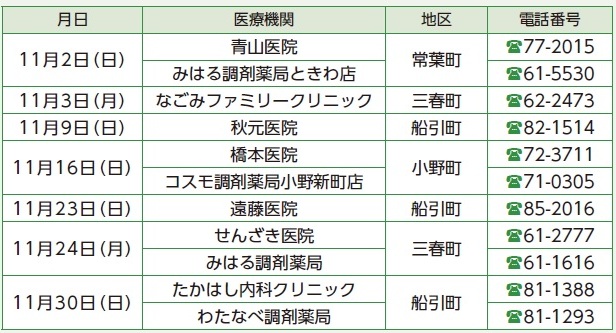 くらし ほけんだよりー11月の休日当番医ー 40/44 前の記事 次の記事 発行日 : 2025年10月01日 自治体名 : 福島県田村市 広報紙名 : たむら市政だより 令和7年10月号 診療時間:9:00〜18:00 ※医療機関によっては17:00まで 変更される場合があります。受診前に、医療機関に確認してください。 福島医療情報ネットのホームページからも検索することができます。 Tweet シェアする ほけんだよりーたむら市民病院からー My Angel