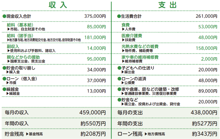 6年度の歳入約275億円と歳出約263億円を5千分の1にして、年収約550万円の家計に置き換えて毎月の平均を出してみました。市にはさまざまな種類の収入と支出があり、一般の家庭とは少し違いますが、田村市の家計簿は次のような内容になっています。みなさんの目にはどう映るでしょうか。