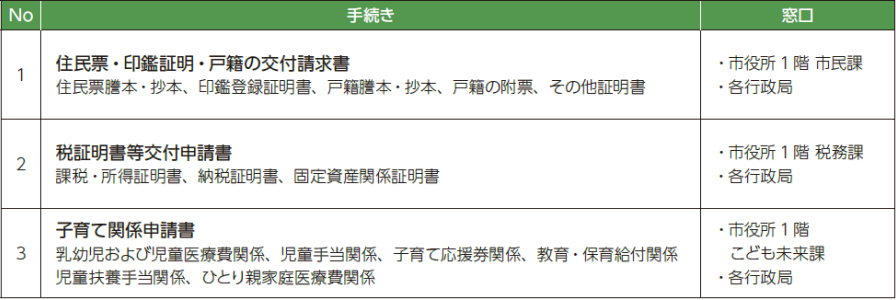 市は、住民票や戸籍等の証明、税関係証明を請求する際の各種申請書の氏名・住所などの記入を省略できる「書かない窓口」のサービスを開始しました。マイナンバーカードを読み取ることで、申請書の「氏名・住所・生年月日・性別」が自動印字され、フリガナや電話番号、その他必要事項の記入のみで手続きができるようになり、「書く手間」の軽減を図ります。