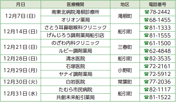 くらし ほけんだよりー12月の休日当番医ー 40/44 前の記事 次の記事 発行日 : 2025年11月01日 自治体名 : 福島県田村市 広報紙名 : たむら市政だより 令和7年11月号 診療時間:9:00〜18:00 ※医療機関によっては17:00まで 変更される場合があります。受診前に、医療機関に確認してください。 福島医療情報ネットのホームページからも検索することができます。 Tweet シェアする ほけんだよりーたむら市民病院からー My Angel