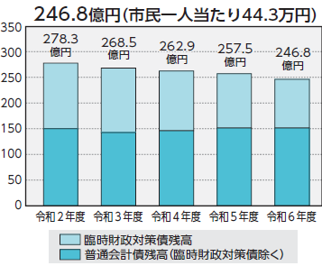 市債残高は、新たな借り入れがあったものの、償還(返済)が進んでおり、全体では前年度から約10.7億円減少しました。