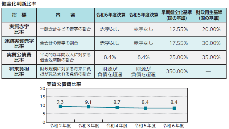 令和6年度の決算を基に、法で定められた4つの指標の健全化判断比率を算出しました。本市は全ての指標で国の基準を下回り、健全な状態を保っています。なお、東日本大震災関連事業を除く通常事業が増加傾向にあるため、持続可能な財政運営に向けて、財政の健全性の維持に努めます。
